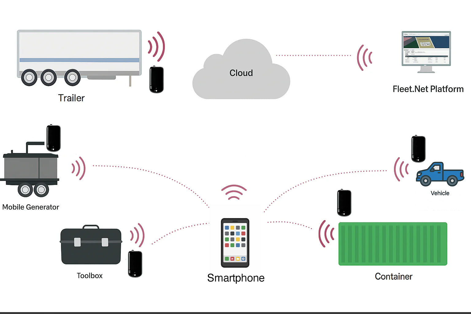 The Mini Air Tracker connects with any smartphone within a 200-foot range. When detected, the smartphone sends the tracker’s ID, time, and approximate location to the Fleet.Net cloud.